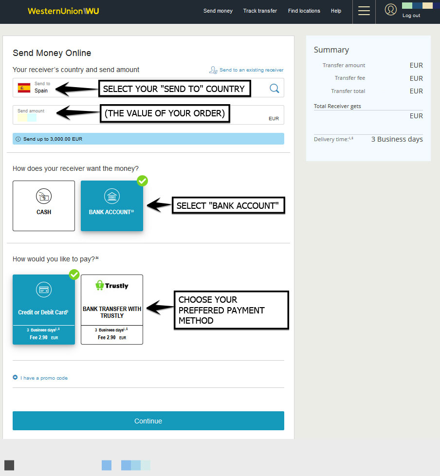 Complete su transferencia y guarde el número de seguimiento (MTCN), luego envíenos un correo electrónico confirmando su pago proporcionando el recibo de pago que muestre a qué cuenta se realizó el pago, el monto en euros esperado y el MTCN para que podamos rastrear su transferencia - [email protected]
